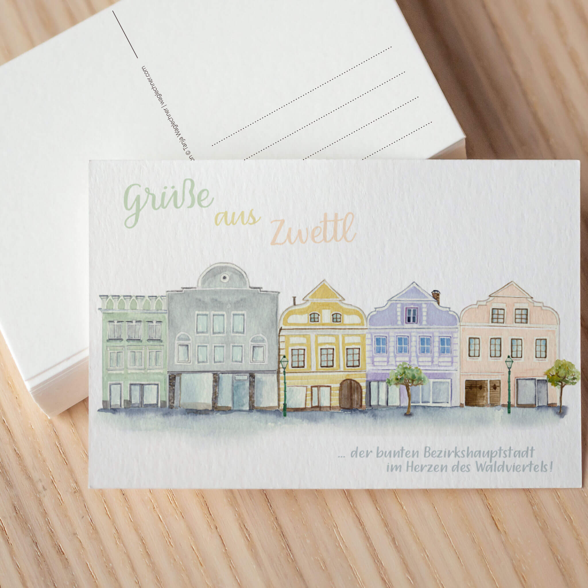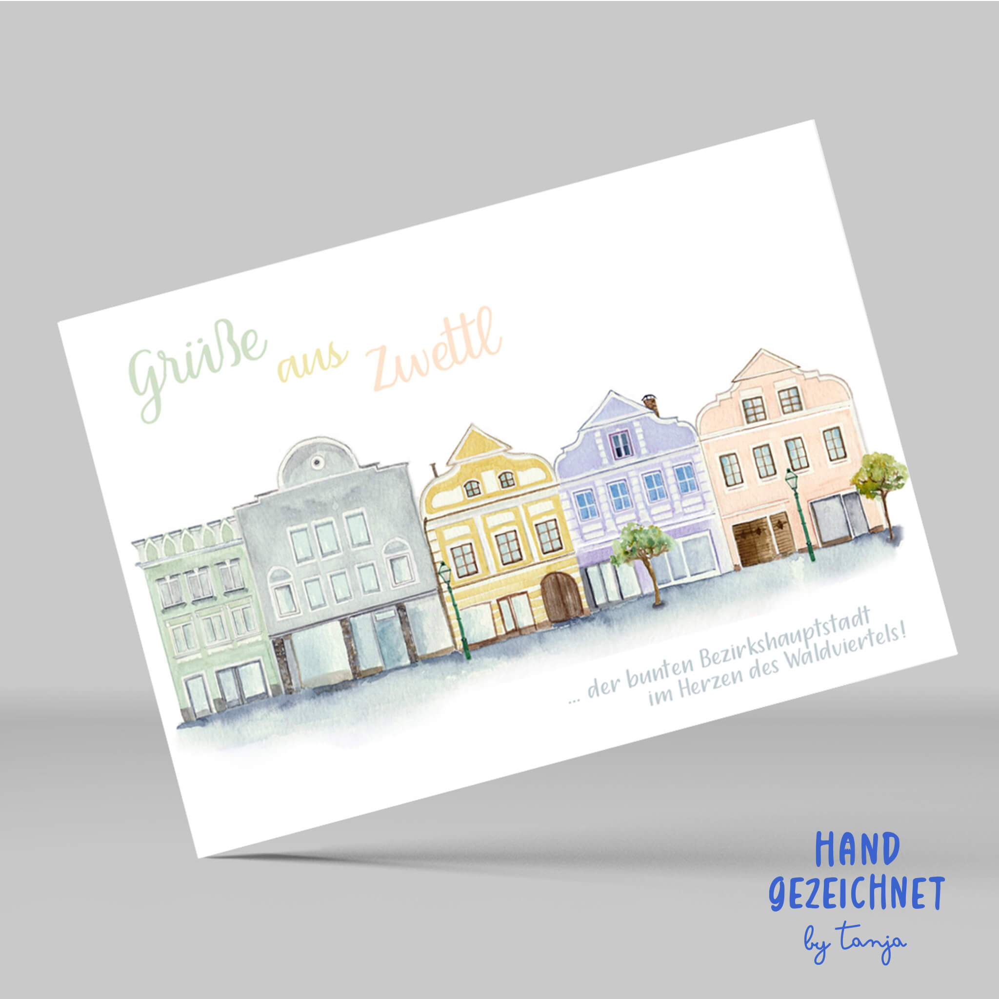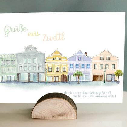 Aquarell Häuserreihe der Zwettler Landstraße Format A6 Mit viel Liebe von Hand gezeichnet und auf Postkartenkarton (260 g) gedruckt Rückseite beschreibbar. Schreib mal wieder einem lieben Menschen! Made in Waldviertel :-)