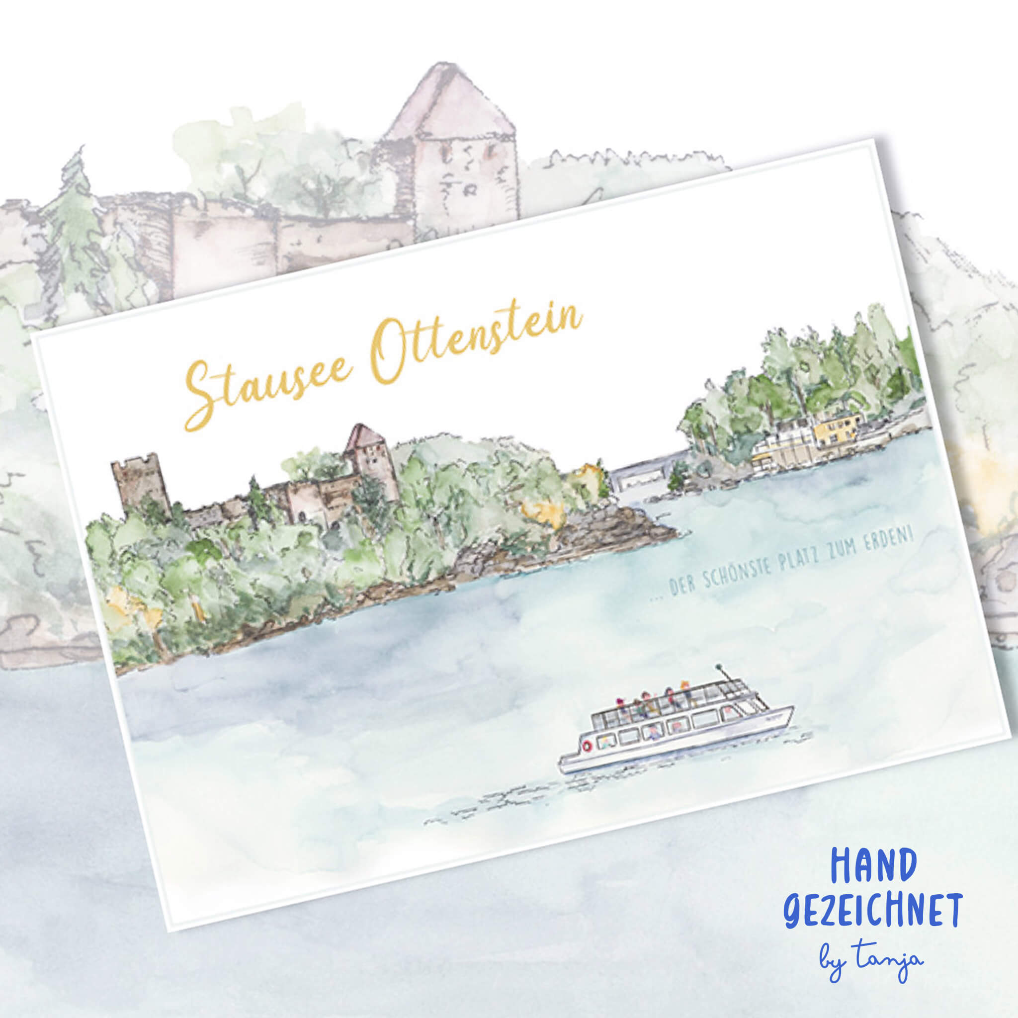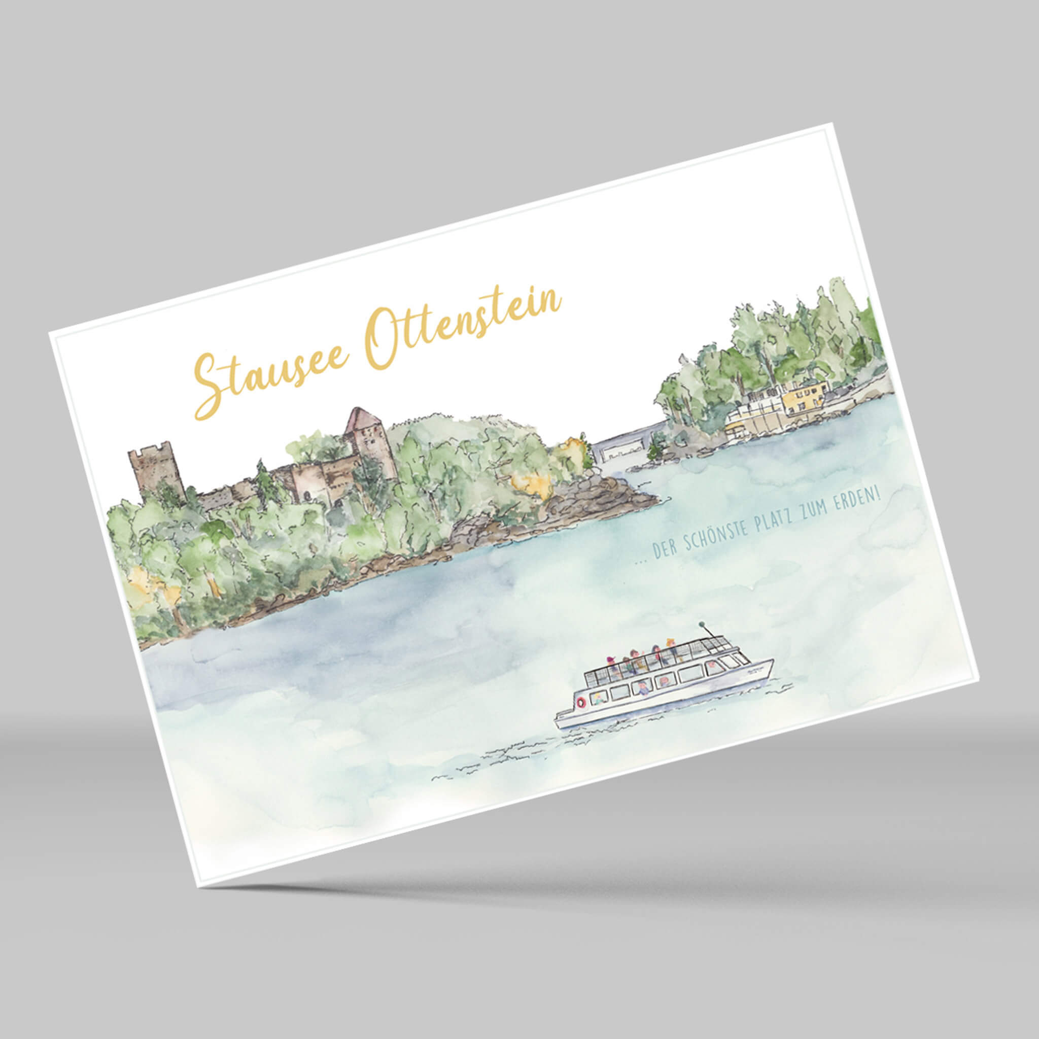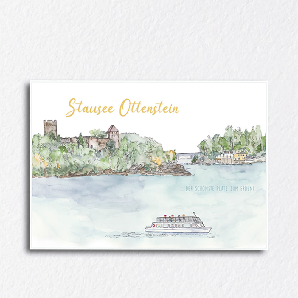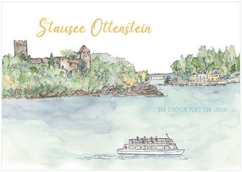 Aquarell vom Ottensteiner Stausee als Grußkarte. Das Naturjuwel im Waldviertel - der schönste Platz zum Erden! Ruine Lichtenfels mitten im Stausse. Wunderschöner Ausflugsort. Von Hand gezeichnet und auf Postkartenkarton (260 g) gedruckt. Rückseitig Platz für ein paar Zeile, Adressfeld und Briefmarkenfeld. Made im schönen Waldviertel.