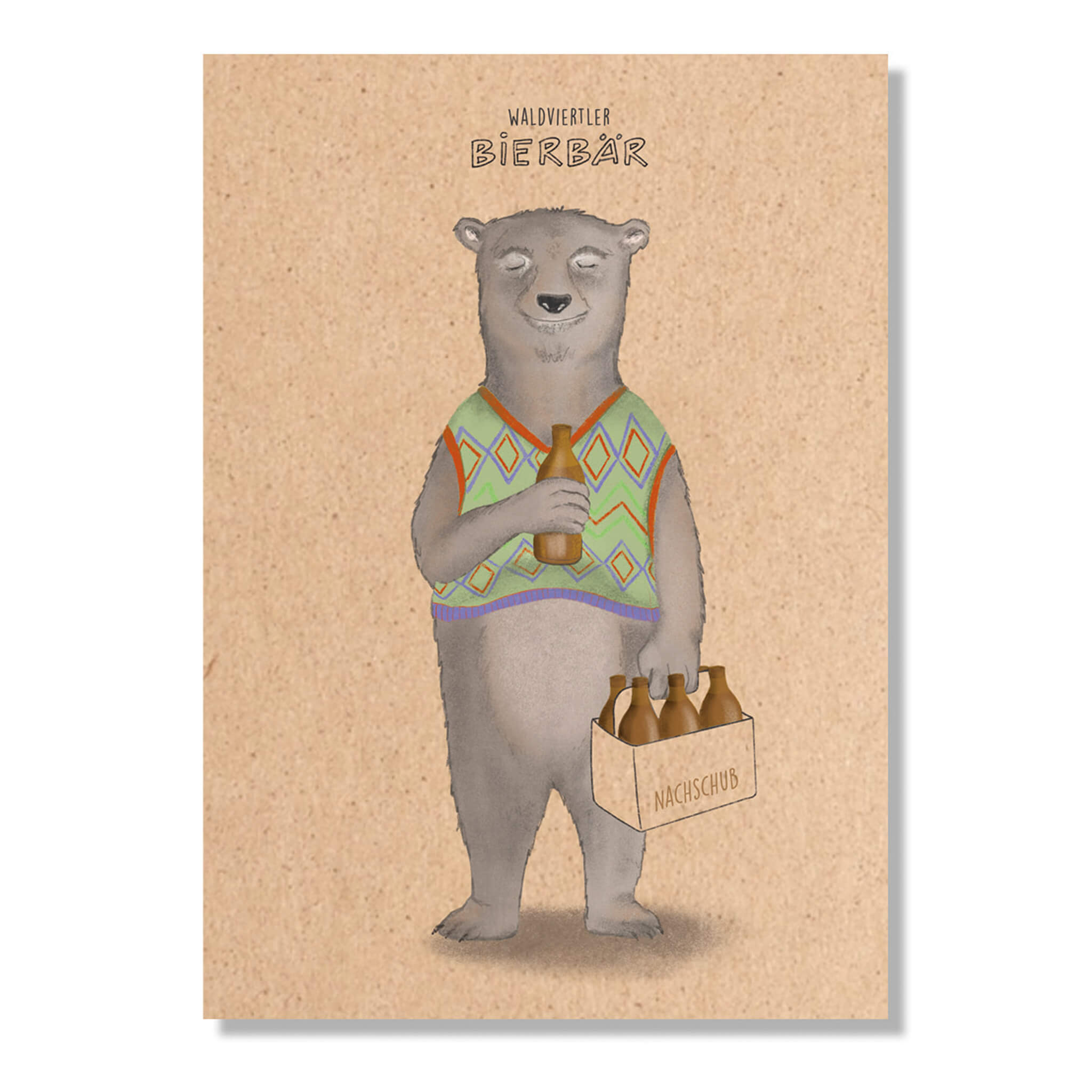 Wer erkennt jemanden im Bierbär? Die Waldviertler trinken ja bekanntlich gerne Bier, so auch der Bär! A6 Postkarte aus dickem Graspapier, Rückseite beschreibbar mit Adressfeld und Briefmarkenfeld