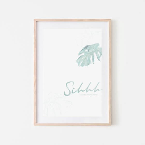Poster Print mit Spruch "Schhh ... is used to call for silence" eine charmante Weise um Ruhe zu bitten! A3 Poster mit handgezeichnetem Aquarell Fensterblatt (Monstera) dezente Minttöne auf weißem Strukturpapier 250 g Schmücke mit den Sprücheposter dein Zuhause oder beschenke deine Lieben.